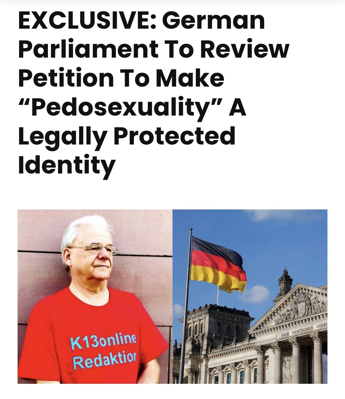 I Tyskland, har en pro-pædofil aktivistgruppe har fået en petition til behandling i det tyske parlament, inklusive krav om at “pedosexuality” (pædofili som beskyttet identitet) skulle op på bordet. Dette har været genstand for debat i internationale medier og civilsamfundet. (Reduxx)