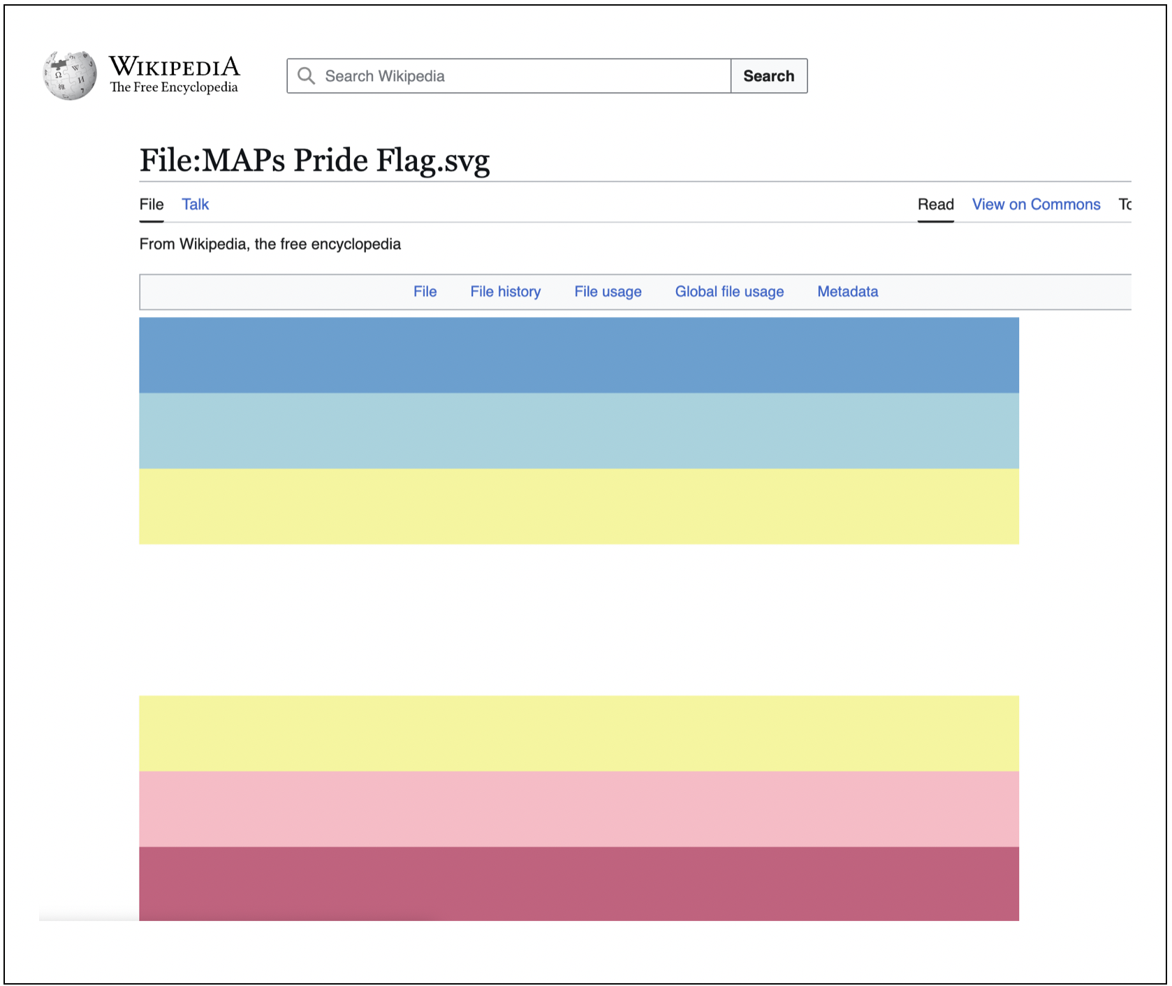 Flaget helt konkret er filen “MAPs Pride Flag.svg” på Wikipedia/Wikimedia Commons. Det beskrives på Commons/Wikipedia som det såkaldte “NOMAP Pride flag”, som blev lavet oprindeligt af en Tumblr-bruger og siden er blevet brugt af nogle personer, der identificerer sig som MAPs (“Minor-Attracted Persons”). (Wikipedia)