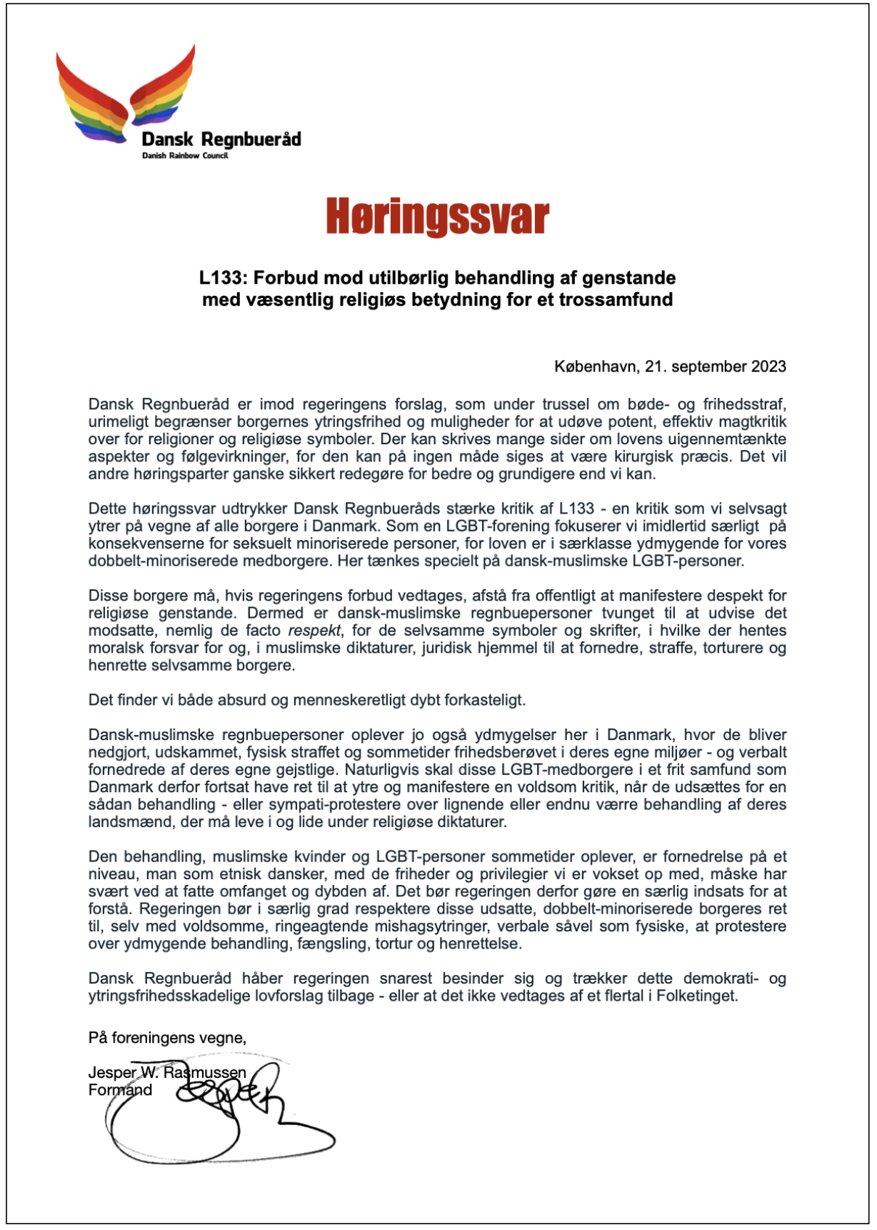 Det gjorde den iranske eksilkunstner Firoozeh Bazrafkan her på dagen fra hvilken man nu ikke længere må behandle religiøse skrifter utilbørligt. Det har Dansk Regnbueråd det voldsomt stramt med af grunde, du kan læse om i vores høringssvar ifm. lovforslaget.